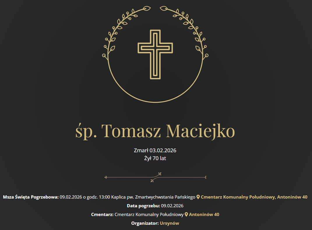 Z przykrością zawiadamiamy o śmierci naszego Kolegi Ś.P. Tomasza Maciejki, zmarł  w dniu 03.02.2026 r. przeżywszy 70 lat.