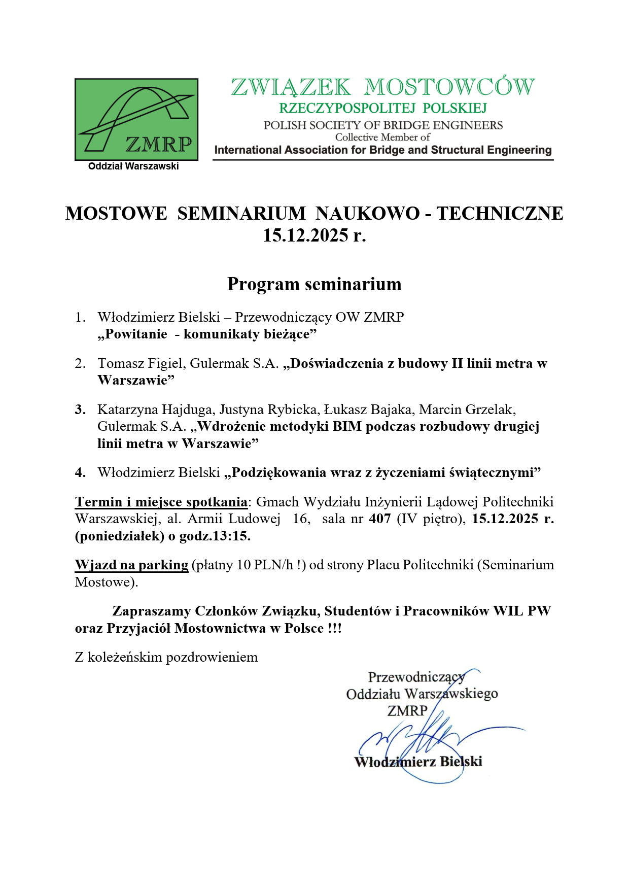 Szanowne Koleżanki, Szanowni Koledzy mamy przyjemność ogłosić, że w dniu 15 grudnia odbędzie się kolejne seminarium naukowo-techniczne organizowane przez Warszawski oddział Związku Mostowców Rzeczypospolitej Polskiej. Poniżej szczegółowy program seminarium.